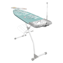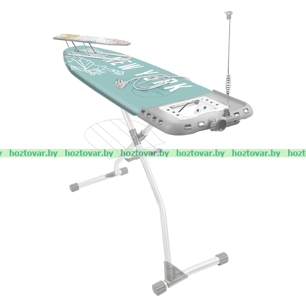 Широкая гладильная доска с электросоединителем и подставкой под утюг и парогенератор. Вместительная полка для белья и переносной подрукавник.
