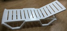Лежак (шезлонг) полимерный Изготовлен из ударопрочного пластика. Длина - 185 см, ширина -64 см., высота - 35 см. Вес - 9,5 кг. Допустимая нагрузка – 180 кг. Наклон спинки - 5 позиций. Цвет - белый, т/зеленый.