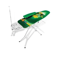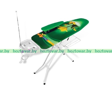 Размеры поверхности для глажки: 120х38 см. В основе стола - цельный лист металла с отверстиями для прохождения пара. Покрытие - хлопок с яркими цветами. Подставка с невоспламеняющимися силиконовыми приспособлениями. Оборудована полкой для белья. Размер доски в сложенном состоянии: 38х153х11 см. Цвет чехла: в ассортименте Цвет ножек: белая эмаль Вес доски: 7.4 кг.