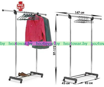 Вешалка-сушилка "PACO SUPER" Материал: сталь с блестящим хромовым покрытием и пластиковая отделка разных цветов (черный, голубой, оранжевый) Максимальная нагрузка до 25 кг. Максимальная высота 172 см. Высота регулируется. 6 вешалок, 80 см места для обуви. Длина верхней рабочей штанги от 80 см до 147 см. Подвижные опоры. Производство: Gimi, Италия