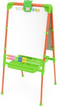 Двухсторонний мольберт для детей от 1,5 лет. Внимание! В комплекте мелкие детали! • 2 рабочие поверхности: для рисования мелом, для рисования маркером и магнитов. • Регулировка высоты от 755 до 1100 мм. • Размер рабочей поверхности 530х470 мм. • Пенал для хранения мелков, маркеров. • Цветные счеты. • Магнитный набор в комплекте (русская азбука, цифры, знаки препинания, мозаика).