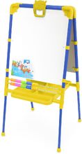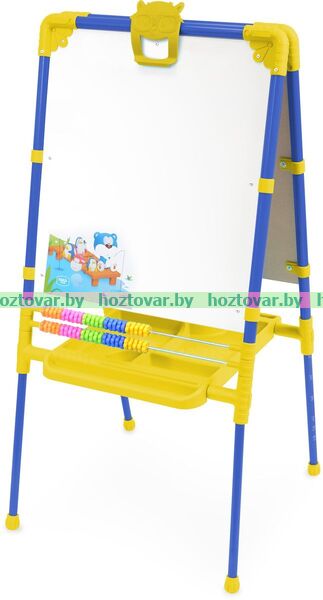 Двухсторонний мольберт для детей от 1,5 лет. Внимание! В комплекте мелкие детали! • 2 рабочие поверхности: для рисования мелом, для рисования маркером и магнитов. • Регулировка высоты от 755 до 1100 мм. • Размер рабочей поверхности 530х470 мм. • Пенал для хранения мелков, маркеров. • Цветные счеты. • Магнитный набор в комплекте (русская азбука, цифры, знаки препинания, мозаика).