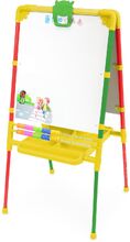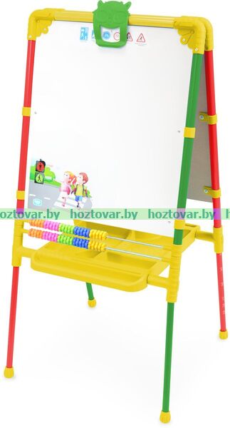 Двухсторонний мольберт для детей от 1,5 лет. Внимание! В комплекте мелкие детали! • 2 рабочие поверхности: для рисования мелом, для рисования маркером и магнитов. • Регулировка высоты от 755 до 1100 мм. • Размер рабочей поверхности 530х470 мм. • Пенал для хранения мелков, маркеров. • Цветные счеты. • Магнитный набор в комплекте (русская азбука, цифры, знаки препинания, мозаика).