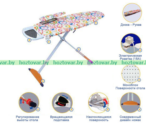 Размеры поверхности для глажки: 125х42 см. В основе стола - пресованный моноблок. Покрытие - хлопок с яркими цветами. Подставка с невоспламеняющимися силиконовыми приспособлениями. Размер доски в сложенном состоянии: 48х154х8 см. Цвет чехла: в ассортименте Цвет ножек: белая эмаль Вес доски: 8.8 кг.